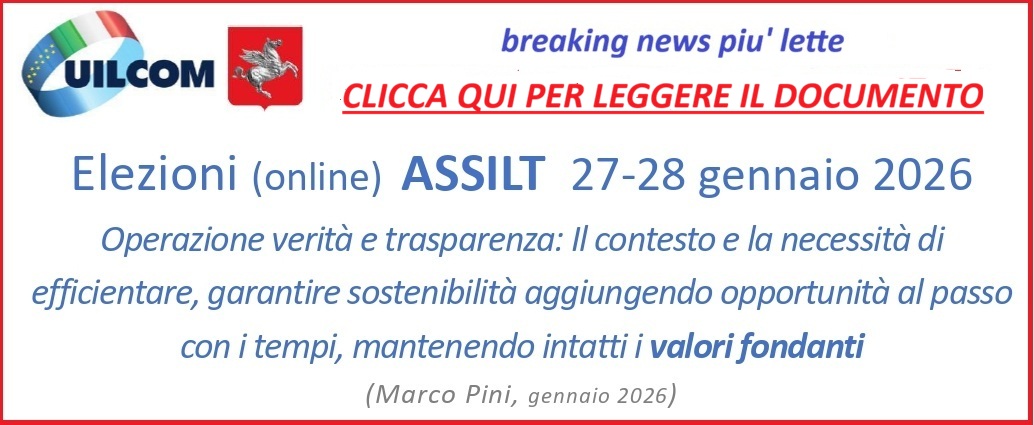 23/1/26 - Riceverai a breve una mail da elezioni(at)skyvote_it contenente un link per poter (da martedì prossimo ore 9), votare ed eleggere i rappresentanti ASSILT. Al fine di condividere riflessioni utili e non scontate rispetto al miglioramento del servizio complessivo offerto dalla nostra Associazione ti invitiamo a cliccare sull'immagine sopra/a fianco per una lettura - un po' lunga ma necessaria vista l'importanza che per tutti noi ha ASSILT e sostenere la Lista UILCOM (si vota solo la Lista). All'ultima pagina di questo documento trovi il collegamento alla videoguida al voto. P.s. - In queste ore arrivano mail da noti sindacalisti, che non sono neppure iscritti ad Assilt o non lo erano fino a ieri (quindi neppure potranno votare!) che menzionano l'impegno svolto dai loro candidati (di cui nessuno o quasi si era accorto), ricordando la loro disponibilita', addirittura con "impegno e studio..." ma soltanto adesso che sono a chiedere i voti ! Noi ti chiediamo invece di AFFIDARTI A CHI TI HA SEMPRE AIUTATO E DATO RISPOSTE CONCRETE ! Pertanto votiamo la Lista UILCOM