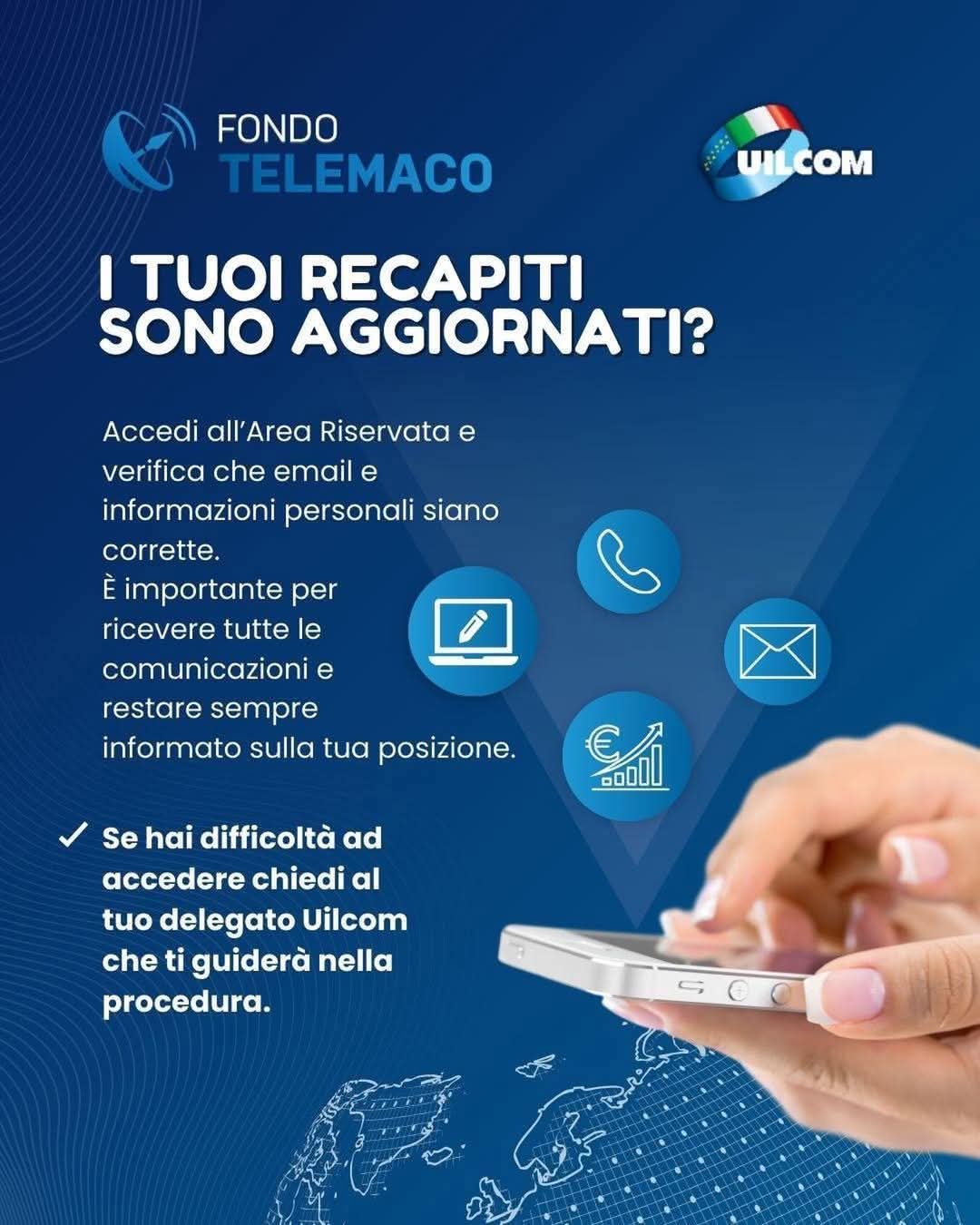Dal 1 gennaio il "contributo contrattuale" a carico dell'azienda e' salito all'1,6%. Soldi in piu' per i lavoratori iscritti a Telemaco. Per coloro che ancora non lo sono, non e' mai troppo tardi! L'adesione al Fondo Pensione Telemaco avviene esclusivamente tramite modulo di adesione online. Segui le istruzioni del video tutorial soprastante. Contattami per supporto e per conoscere anche i vantaggi fiscali ! Marco Pini UILCOM UIL 3316005836